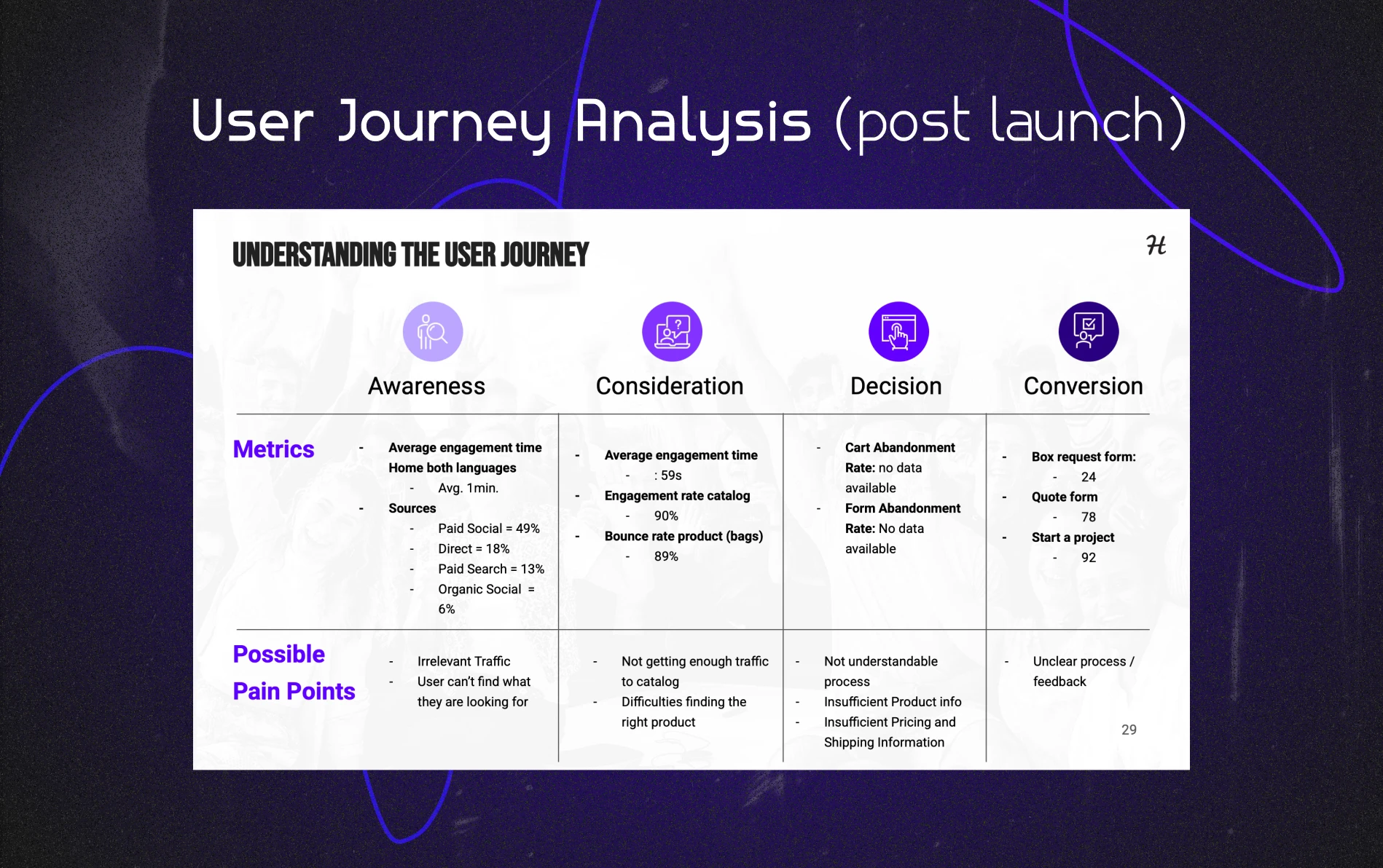 Prioritized a quote first flow instead of a full checkout to support complex & customizable orders Designed modular product detail pages that could evolve in phases post launch analisys & INSIGHTS After launching and to fully understand our user behavior, I combined Google Analytics for high level flows with Hotjar for qualitative and behavioral insights, plus gathering real feedback from our costumers. Key insights: